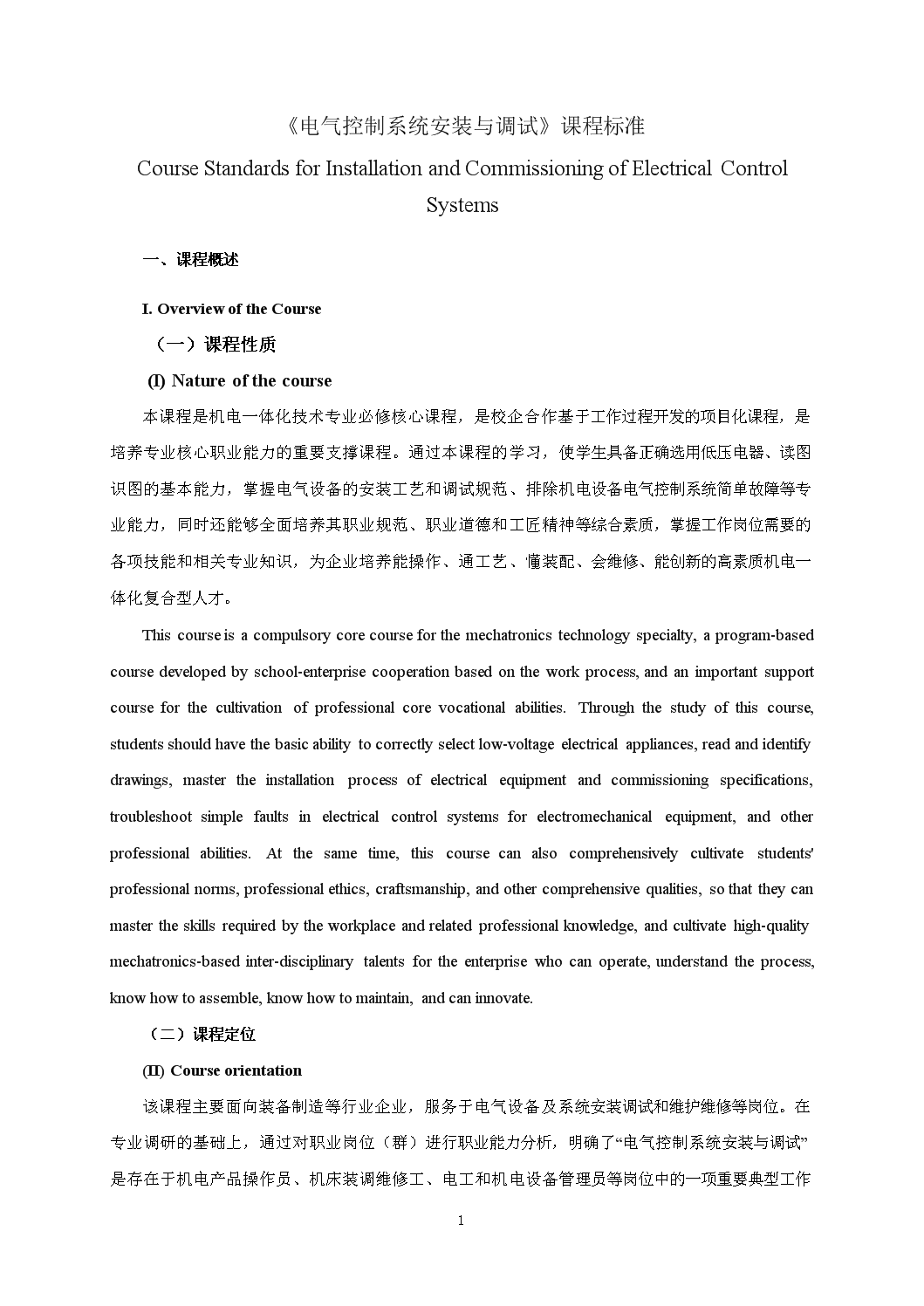 《电气控制系统安装与调试》课程标准 Curriculum Standard of Installation and Commissioning of Electrical Control Systems
