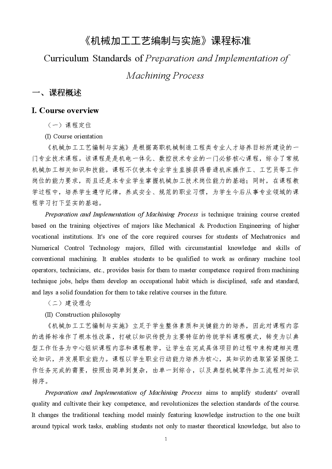 《机械加工工艺编制与实施》课程标准 Curriculum Standards of Preparation and lmplementation of Machining Process