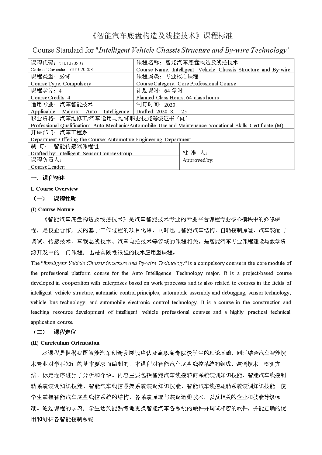 《智能汽车底盘构造及线控技术》课程标准 Curriculum Standard of Intelligent Vehicle Chassis Structure and By-wire Technology