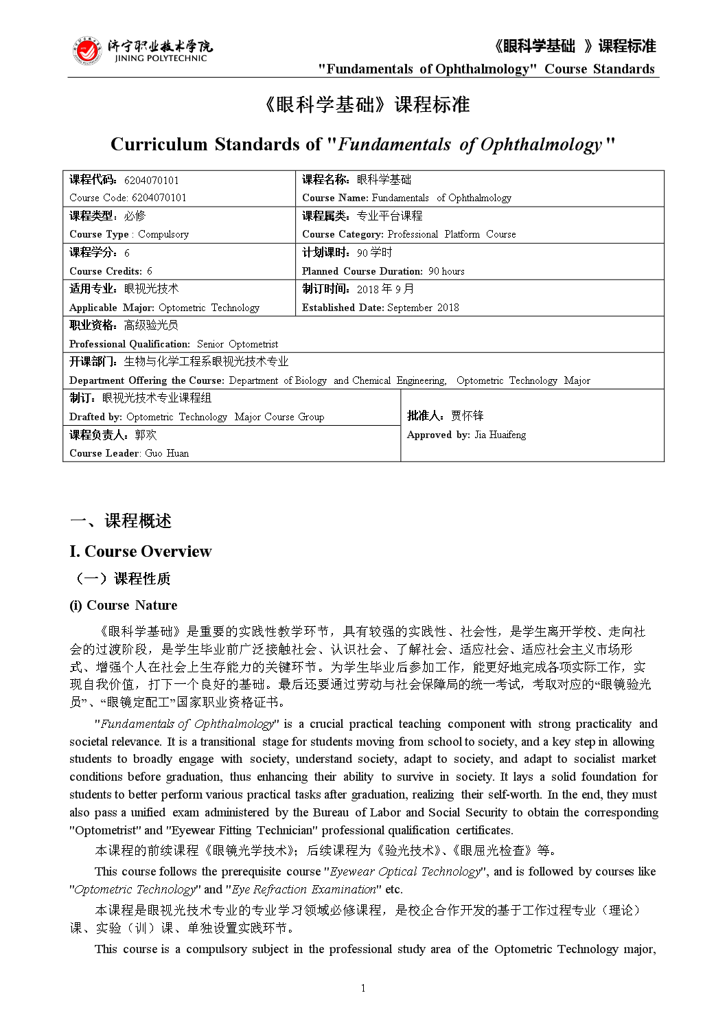 《眼科学基础》课程标准 Curriculum Standard - Fundamentals of Ophthalmology